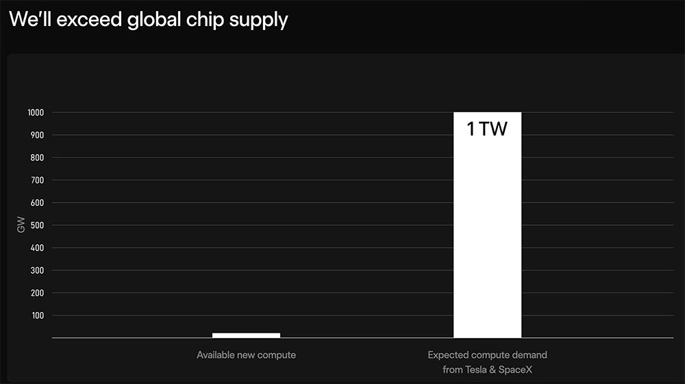马斯克计划每年生产超过1万亿瓦(1TW)的计算能力(逻辑、存储和封装),其中约80%部署在太空,约20%在地面。
