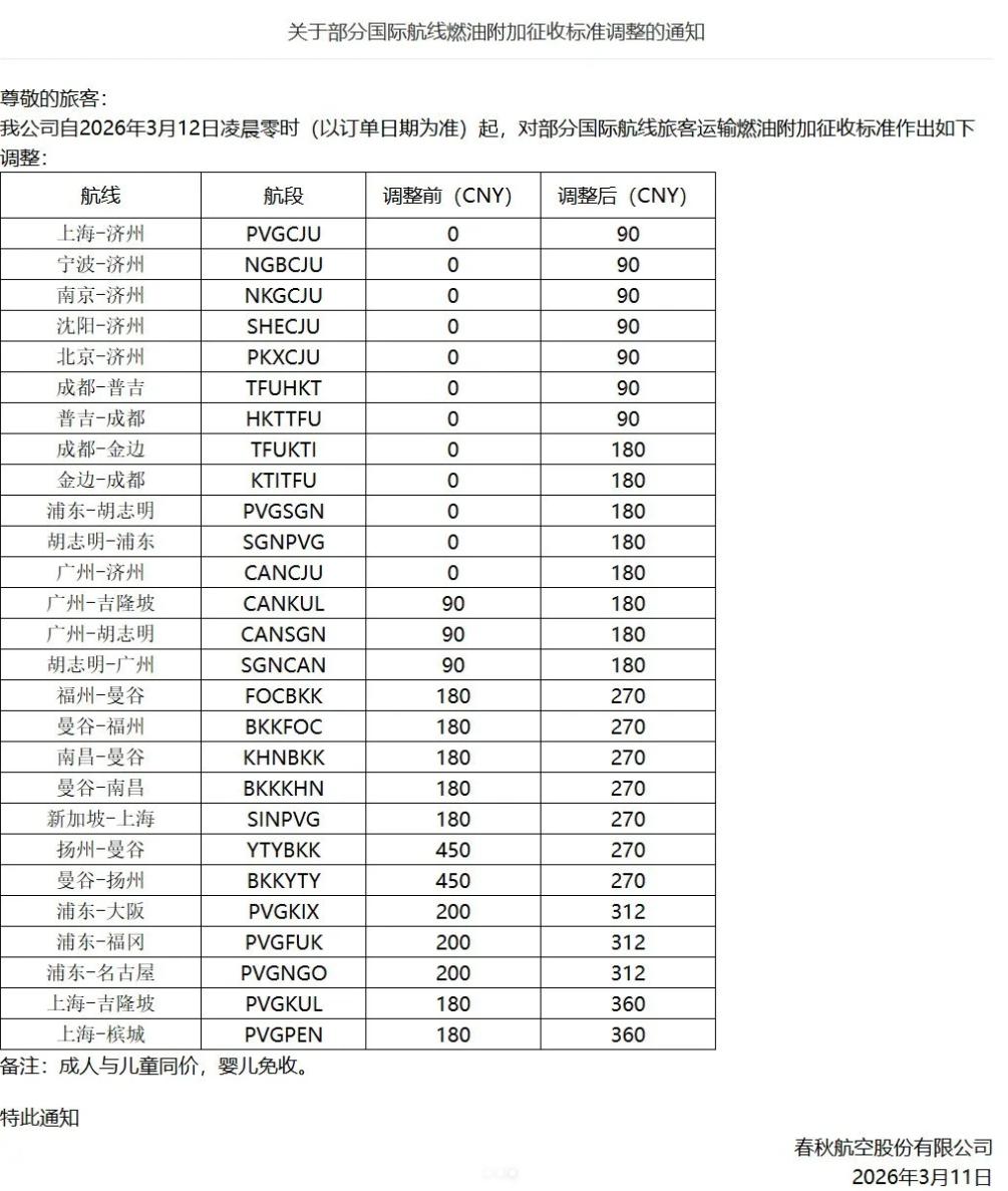 旅界此前报道,春秋航空上海飞吉隆坡和槟城的燃油附加费,直接从180元跳涨到了360元,吉祥航空、国泰航空和香港航空涨幅更加明显,大量航线燃油费直接翻倍,有的甚至一周之内连续两次上调燃油附加费标准。