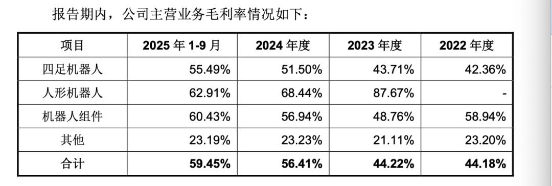 3月20日,宇树公布IPO前的招股书,当中一则数据吸引了我们的关注——2025年前三季度,宇树整体的毛利率达到59.5%。