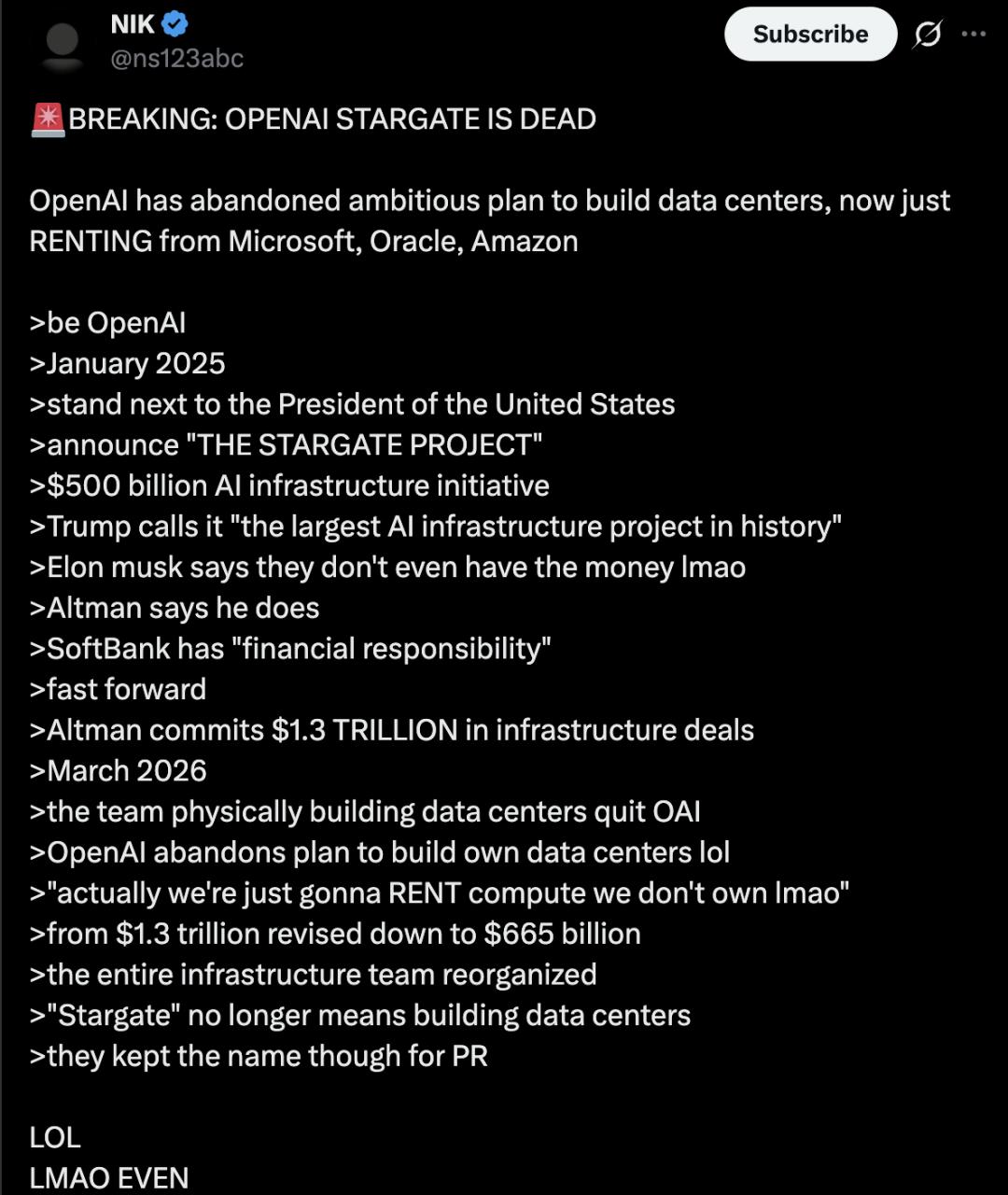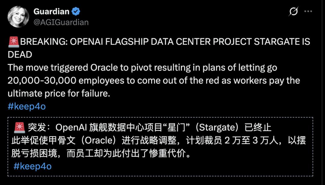 雄心勃勃的算力投资计划「星际之门」(Stargate)项目已终止。