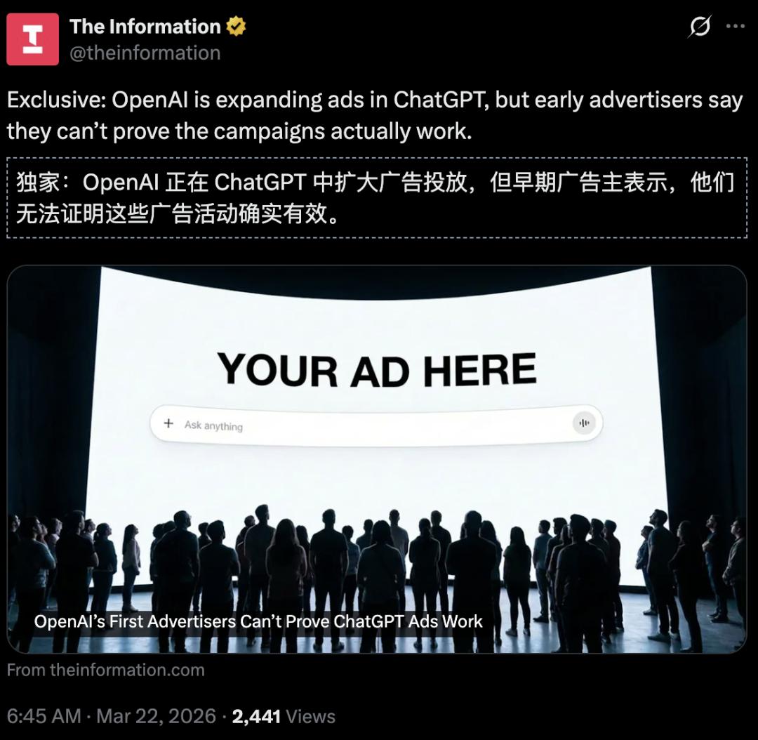 据报道,首批ChatGPT广告也没有得到广告主的信任。
