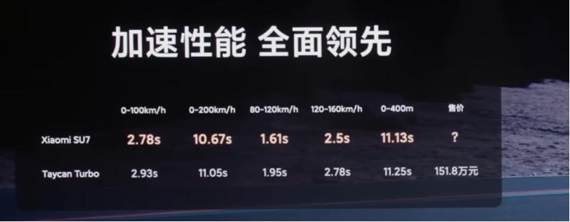 SU7零百加速2.78秒,对比Taycan Turbo 2.93秒;SU7最高车速265km/h,Taycan Turbo是260km/h。