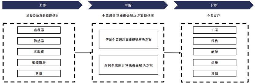 下游涵盖企业级计算机视觉解决方案的各种应用场景,如工业、零售、能源、建筑等。