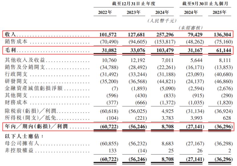 2022年、2023年、2024年及2025年1-9月(报告期),公司的收入分别为1.02亿元、1.27亿元、2.57亿元、1.36亿元。