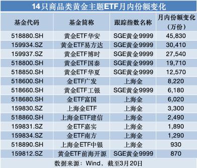 尽管金价持续回调,却并未浇灭投资者的入场积极性。据Wind统计,截至3月20日(上周五),14只商品类黄金主题ETF月内份额均呈现净流入状态,其中5只份额增长过亿。