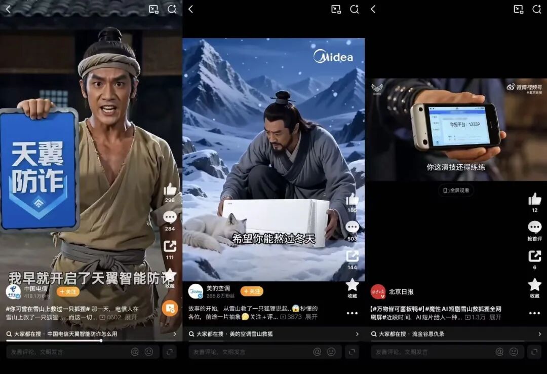 AI工具的普及降低了创作门槛,让更多普通用户从观看者变成创作者。无论是视频剪辑还是剧情设计,AI帮助用户快速生成和修改内容,甚至能自动分析受众喜好,优化创作成果。这种“人人都能创作”的模式,让《雪山救狐狸》的故事在短时间内迅速演化出了大量版本。