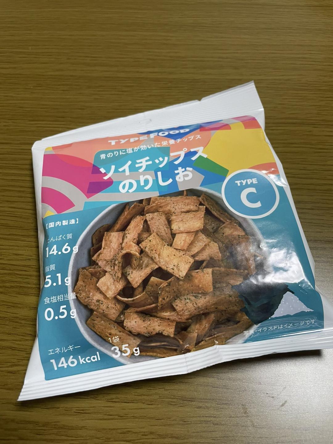 每款产品的包装正面,都印有食品的实物图、代表营养类型的字母标识,以及关键营养信息。例如网友晒出的一包海苔盐味大豆脆片,包装右侧标出了 “TYPEC” 的营养类型标识,左侧则列出了蛋白质、脂肪、盐分含量,以及卡路里数值。