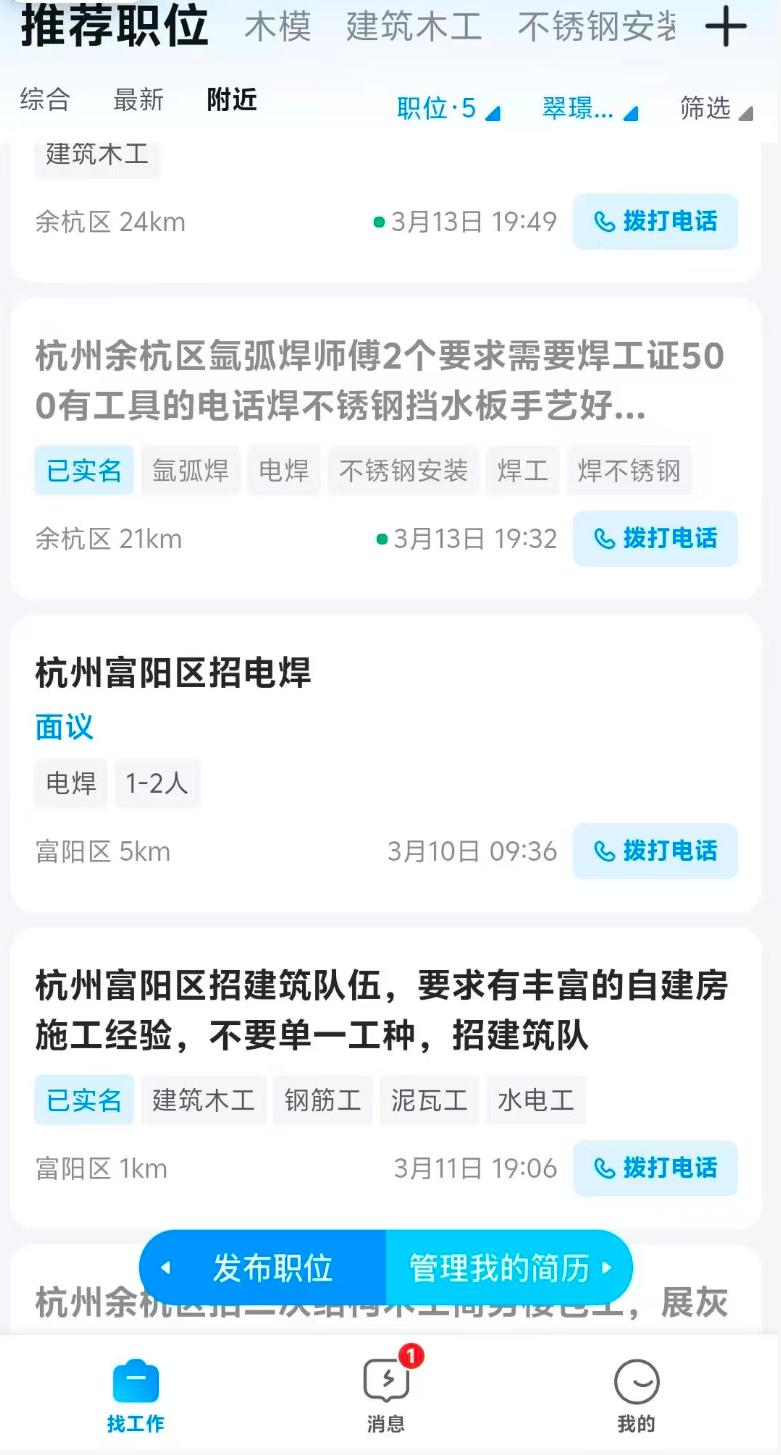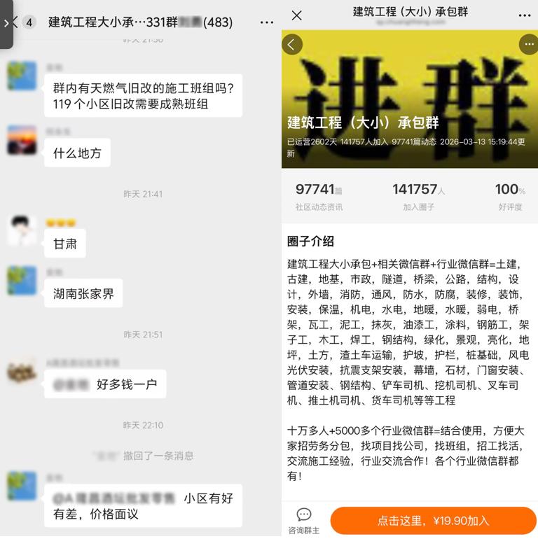 赵师傅给世超展示了,他花了 19.9 加的招工群。他和我说在上面基本找不到工作。一个是要抢,另外是活太散了,什么地方的都有。