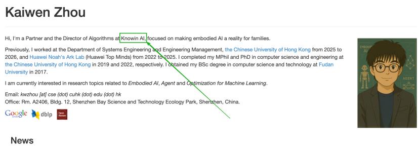他已加入具身创企诺因智能,担任合伙人兼算法主管。