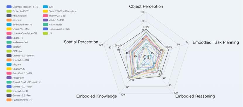 具身操作最相关的单项任务方面,KnowinBrain在Spatial Perception(空间感知)、Object Perception(物体感知)、Embodied Reasoning(具身推理)、Embodied Task Planning(具身任务规划)这四项能力上都排在第一。