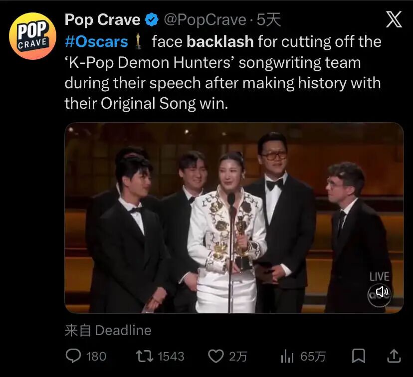 猎魔女团在获奖感言未超时的情况下,被立即打断、切广告;出身亚裔的最佳摄影奖得主奥图姆・杜拉德的感言同样被打断。同场对比,非亚裔获奖者则没有一组受到如此对待。结合奥斯卡过往种族歧视争议,或许我们可以判断:本届奥斯卡在奖项上表现出的去白人至上主义、去西方中心化倾向的确有,但不多。