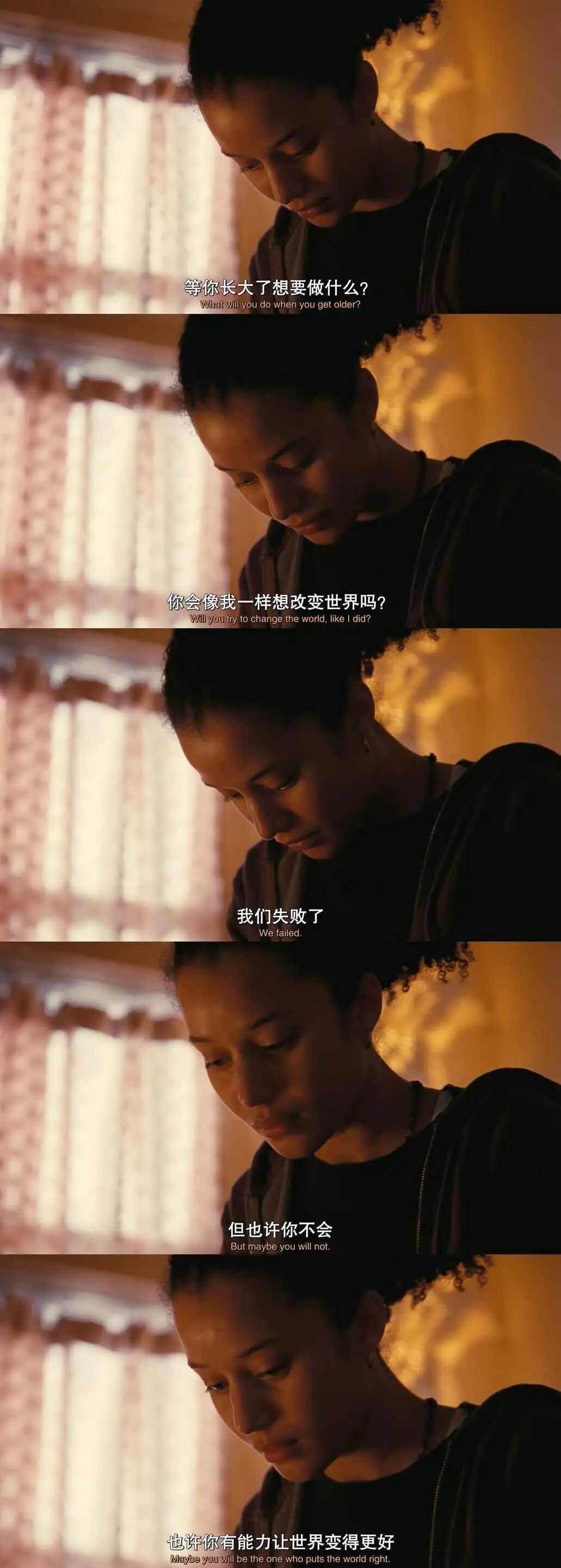 薇拉踩下的,不只是一场无止尽逃亡的刹车,更是这场延续数十年的已经失控的对抗的刹车。那充满代际创伤的战场,在薇拉与父亲相拥、她念出那封革命失败后败逃的母亲写来的信之后,土崩瓦解。她转身,投入新时代的战斗。