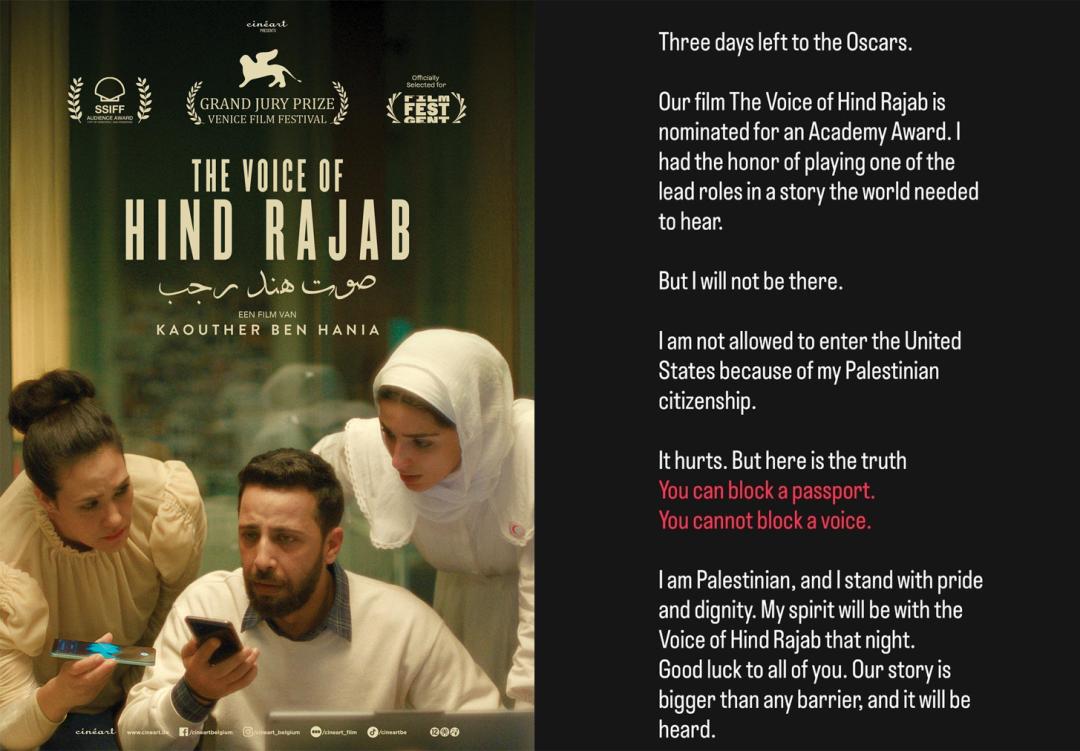 在社交媒体上,莫塔兹发表了如下声明:“由于我的巴勒斯坦国籍,我不被允许进入美国。这令人痛心。但真相是:你可以限制一本护照,你无法阻挡一个声音。我是巴勒斯坦人,我带着骄傲与尊严站在这里。我的精神将与《欣德·拉贾布之声》同在,祝你们所有人好运。我们的故事比任何阻碍都更宏大,它必将被听见。”