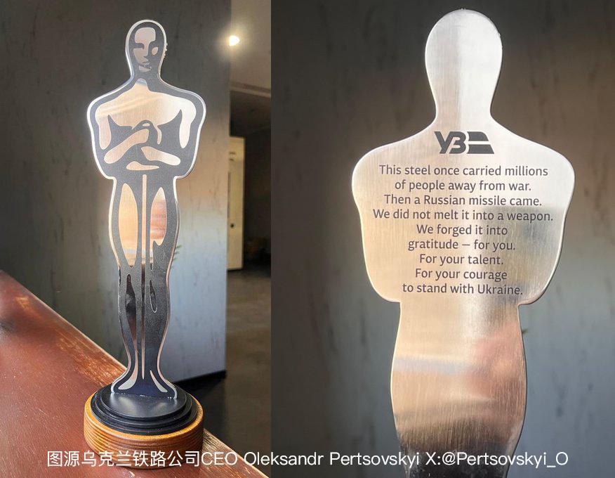 在红毯和余兴派对的大出片中,获得最佳男配角奖项的西恩·潘(Sean Penn)因为正在基辅与乌克兰总统泽连斯基会面,而缺席典礼。乌克兰方面用俄军导弹损毁的列车残骸,为他打造了一座 “钢铁奥斯卡”奖杯,其上刻着:“这块钢铁曾承载数百万人远离战火,而后遭遇俄军导弹袭击。我们没有将它锻造成武器,而是铸成这份谢意献给你,献给才华横溢的你,献给勇敢与乌克兰并肩而立的你。”
