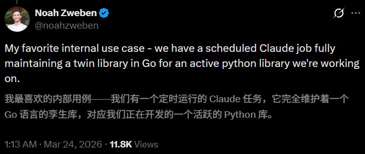 Claude Code的产品经理Noah Zweben激动地表示,团队早就把/schedule用成了基础设施。