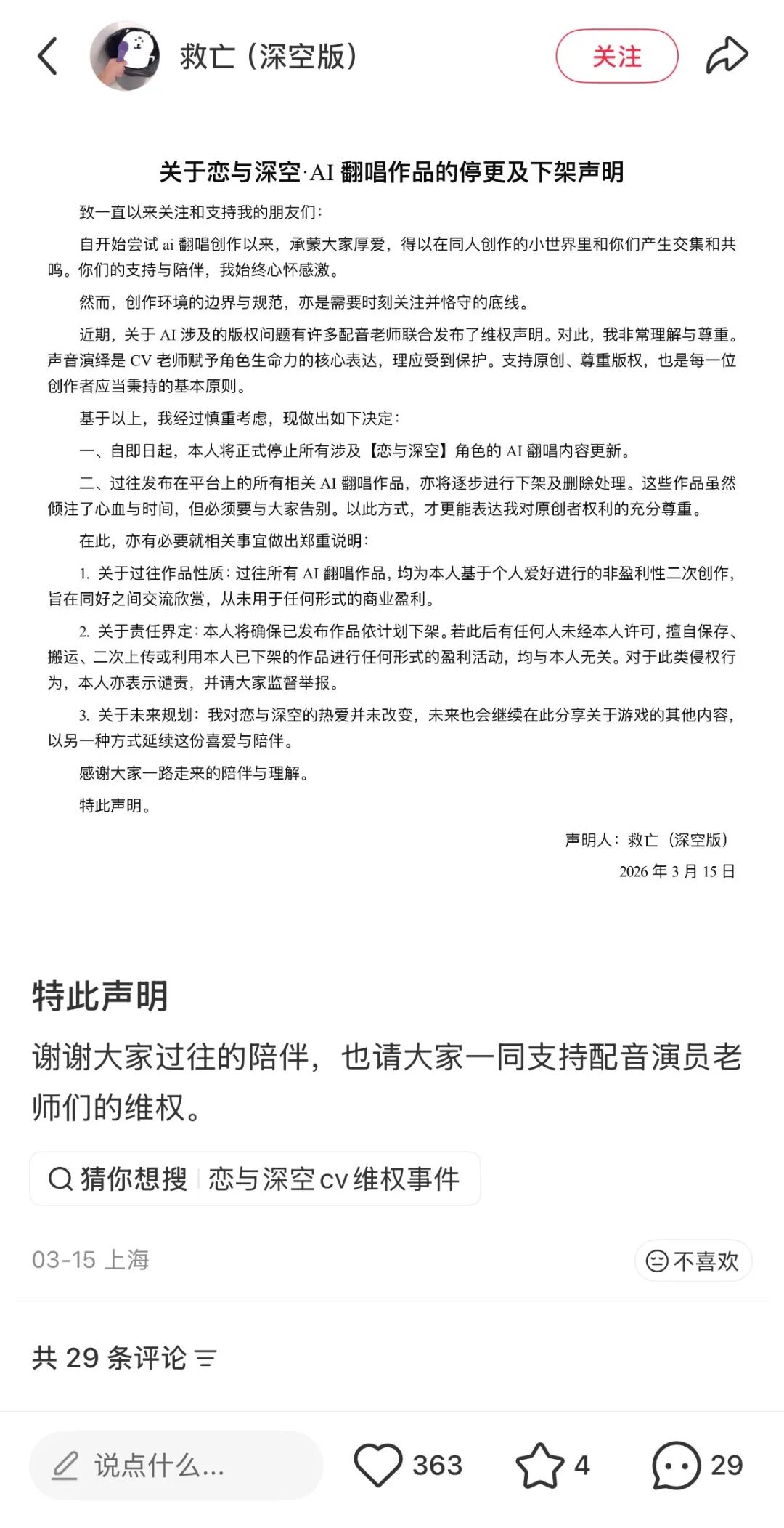 比如在小红书拥有3.6万粉丝的博主“救亡(深空版)”,曾因《恋与深空》AI翻唱二创走红,3月15日其发文称,已下架相关作品并停更,评论区网友虽有惋惜,但均表示支持其选择。