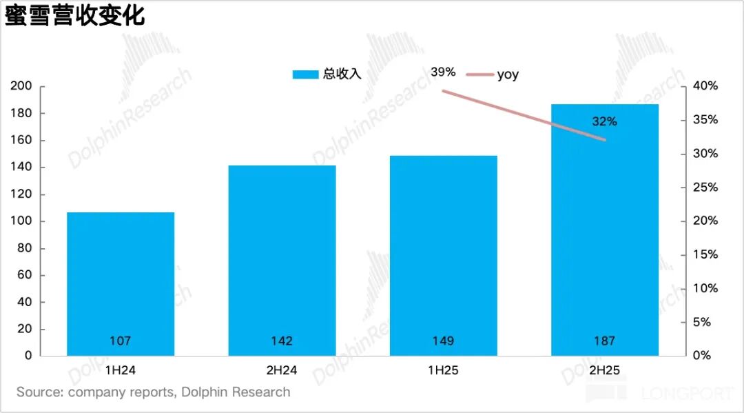 2H25 蜜雪实现营收 187 亿元,同比增长 32%,虽然由于下半年外卖补贴力度的减弱对同店增速造成了一定影响,但在高速开店的带动下,公司整体增速并不低,环比上半年的增速略有下滑(上半年增长 39%)。