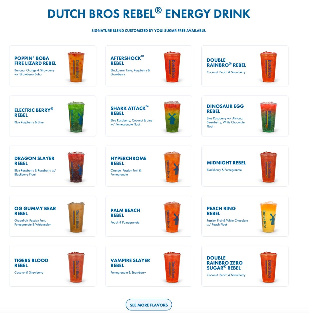 Dutch Bros的首席营销官Tana Davila指出,Dutch Bros认为自己是可定制能量饮品的创造者。这源于顾客希望在能量饮料中添加各种口味。随着时间的推移,Dutch Bros打造了自己的专属能量饮料品牌——Rebel。除了下图中列出的各种产品,品牌还有几十种可供选择的口味,也允许消费者定制想要的配料。