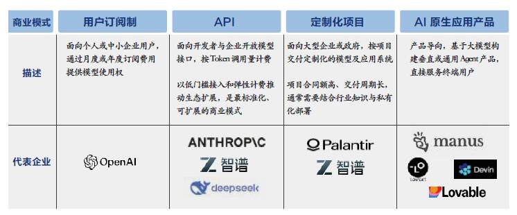 第四种是AI原生应用产品模式。聚焦垂直领域或通用场景,基于大模型构建AI agent等原生应用,直接服务终端用户,强调“场景化、功能化”。这类模式的代表企业多聚焦细分领域,例如专注AI编程的Devin、侧重垂直行业agent开发的Manus与Lovart等,通过“解决具体问题”实现商业闭环。