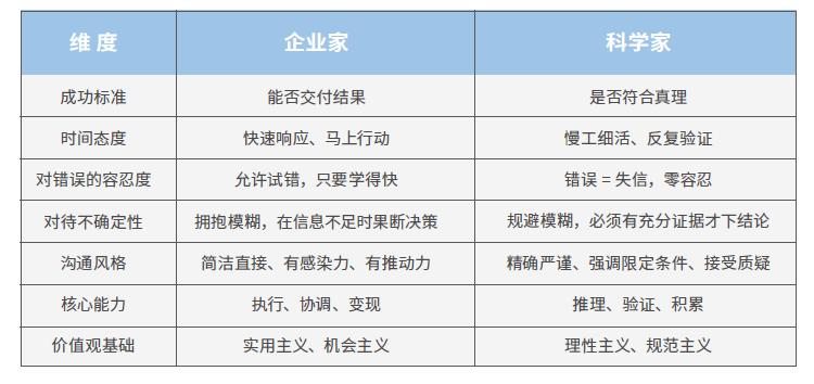 对错误与不确定性的容忍度更是差异明显。科学家视错误为失信,追求零误差,必须有充分证据才会下结论,规避模糊;而企业家必须拥抱不确定性,接纳模糊,在信息不足时果断决策,允许试错但要求快速复盘。