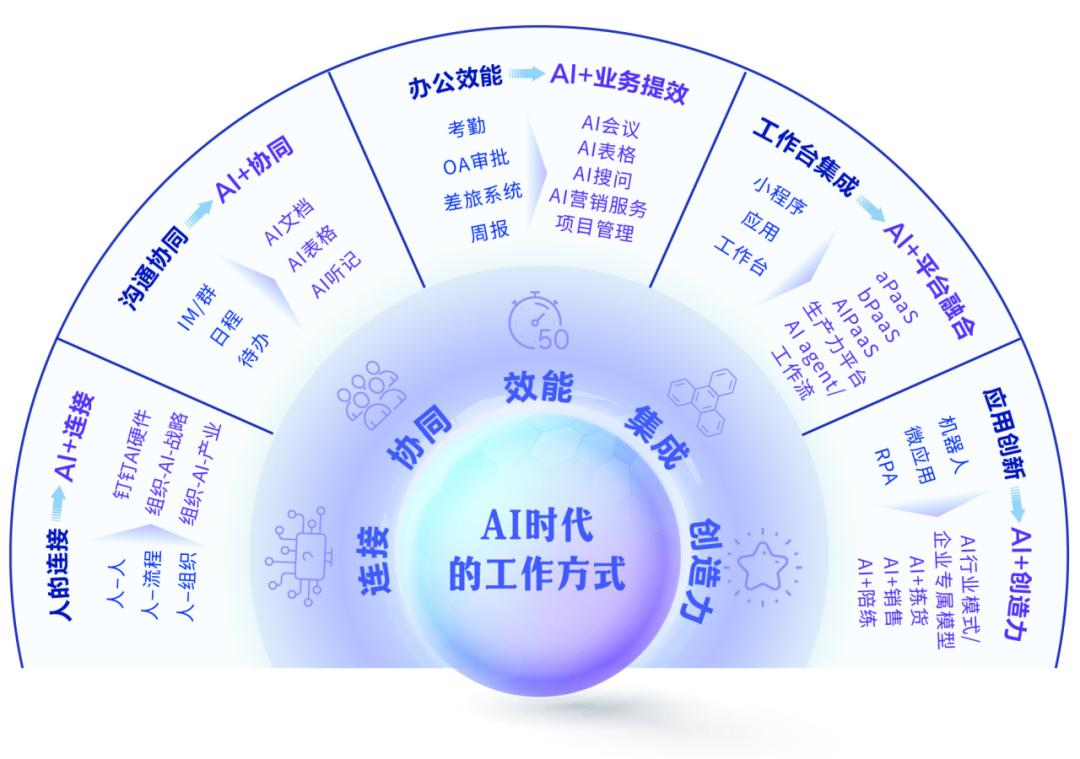 过去,办公场景中充斥着大量重复性劳动:会议纪要靠手写整理、跨语言沟通依赖专业翻译、业务应用搭建需要专业开发者、信息检索要在海量文档中翻找。而一站式AI协同体系,正在驱动新工作方式成为现实——我们可以从连接、协同、效能、集成、创造力这五个维度来理解这一变革。以协同场景为例: