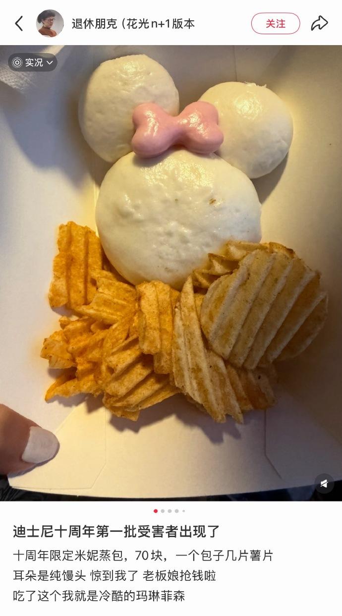 起因很简单,一个标价70元的米妮造型包子,被游客拍下发到网上。画面里,这颗顶着米妮蝴蝶结造型的十周年限定蒸包,搭配几片薯片,摇身一变成了70元的“天价套餐”。于是评论区迅速被“镶金了吗”“这也值70?”这样的情绪填满。