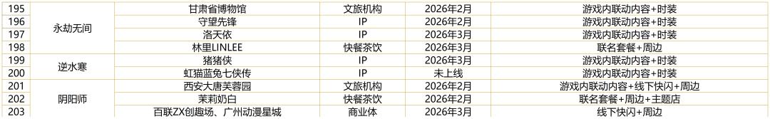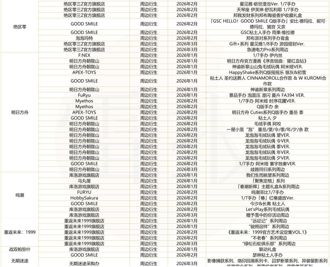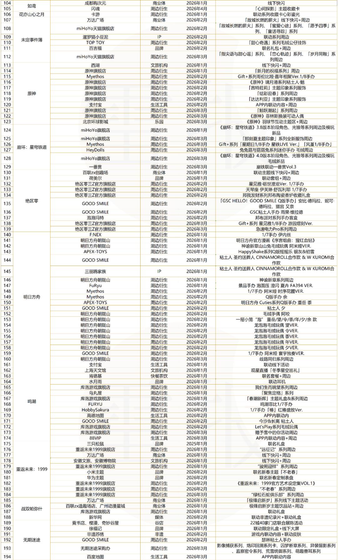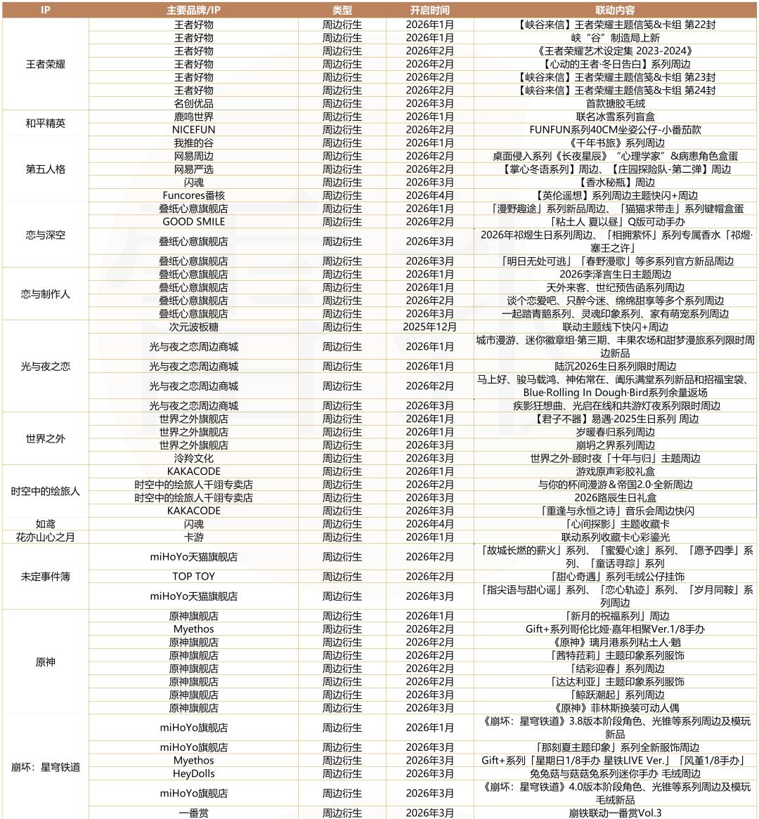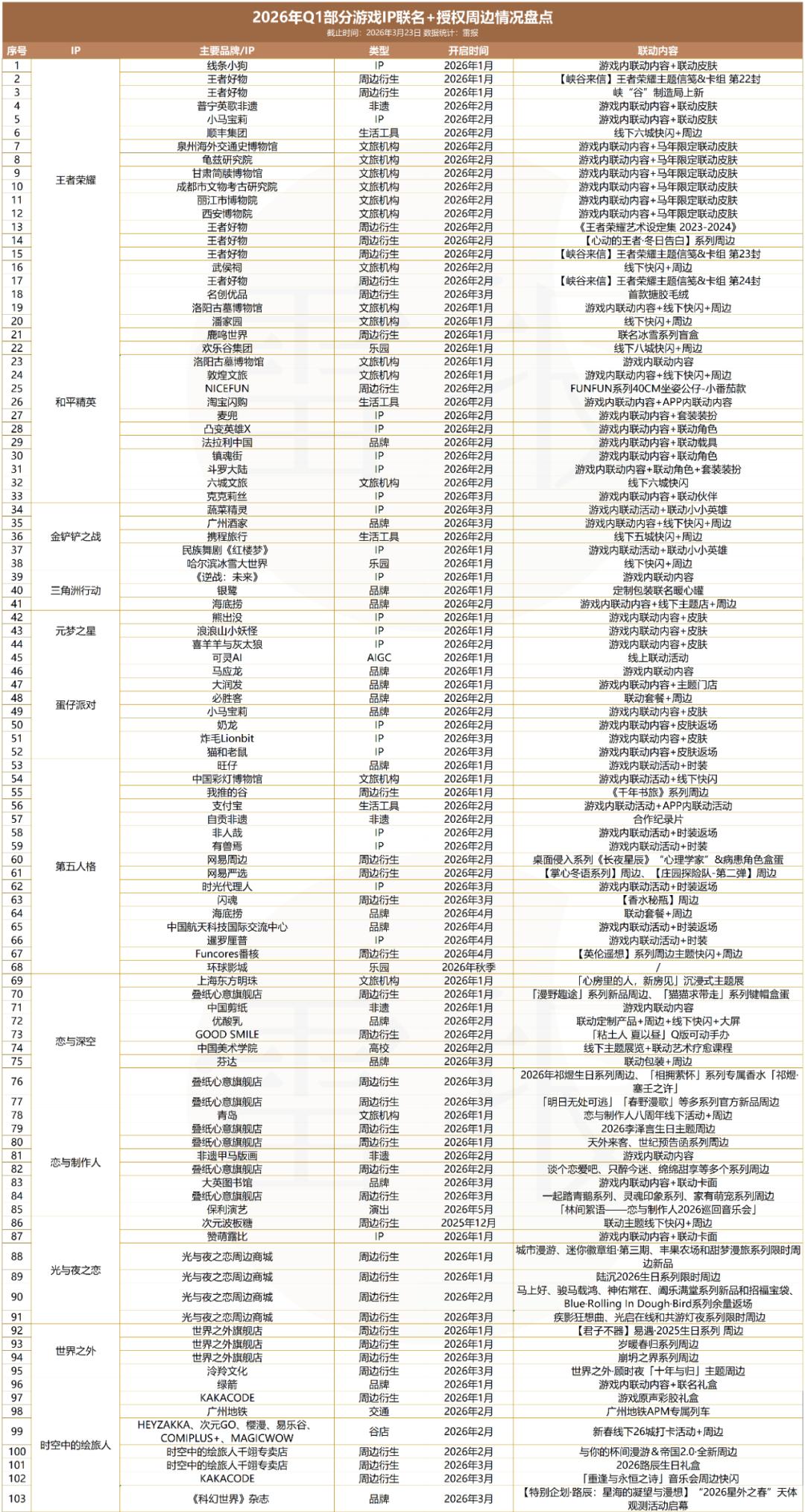 2026年Q1部分主流游戏IP联名/周边授权统计如下(人工统计存在误差):