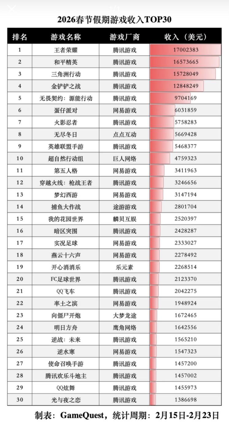 我们不妨看看几组数据:GameQuest基于七麦数据整理发现,2026年春节档,TOP3的《王者荣耀》《和平精英》《三角洲行动》收入分别高达1700万美元、1657万美元、1572万美元,折算下来,这三大IP在短短9天内,各自都创造了超过1亿元人民币的收入。