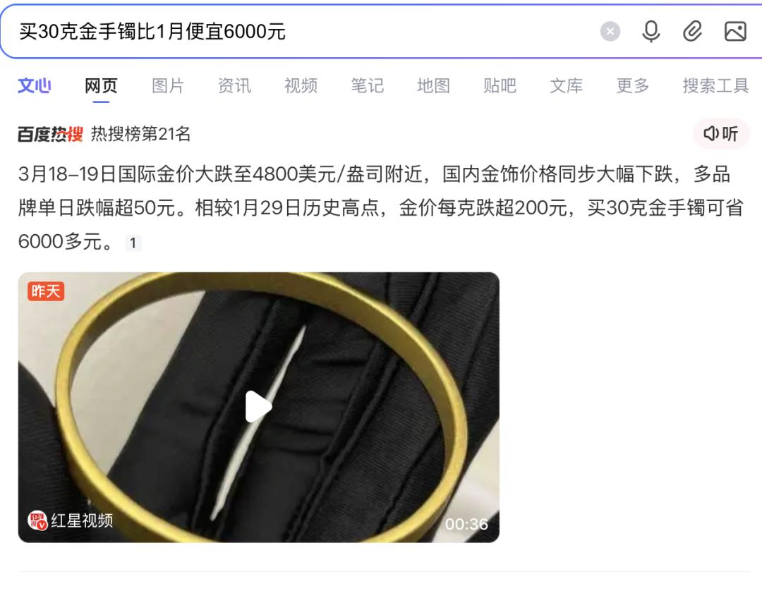 3月20日,“买30克金手镯比1月便宜6000元”的词条冲上热搜第21位。从“闭眼入”到“心慌卖”,只隔了50多天。那些1月冲进去的人,现在怎么样了?
