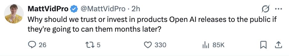 如果OpenAI推出的面向公众的产品,短短数月后就惨遭叫停,那我们凭什么要信任或投资这类产品?