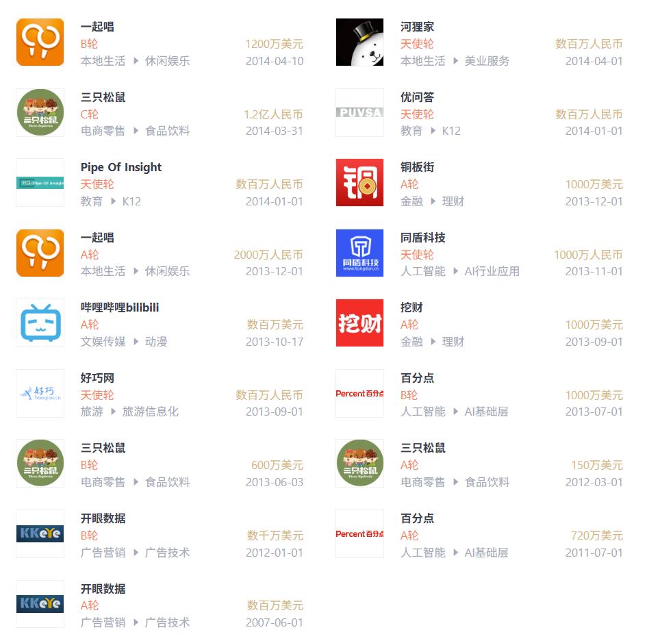 张震早期投资代表案例 图源:IT桔子