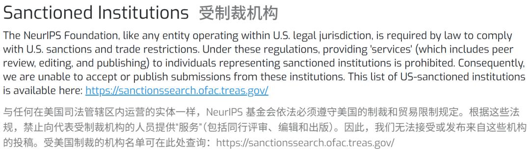 NeurIPS基金会作为美国法律管辖范围内的实体,必须遵守美国制裁与贸易限制法规。根据相关规定,向受制裁机构的代表提供「服务」(包括同行评审、编辑和出版)属于被禁止的行为。因此,我们将不接收也不刊发这些机构的投稿。