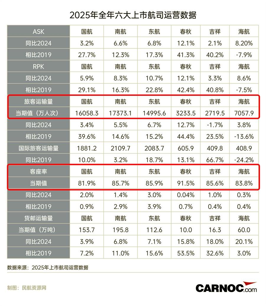民航资源网《2025年六大航司成绩单:客运量突破6亿人次,民营航企领跑增长》