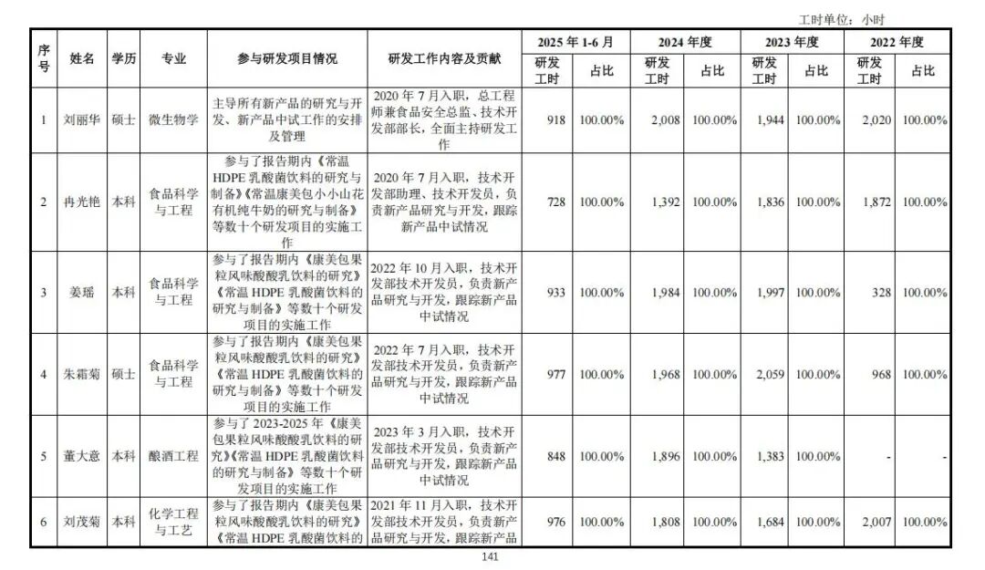 南方乳业介绍,公司研发人员为直接从事研发活动的人员以及与研发活动密切相关的管理人员和直接服务人员,均与公司签署了正式的劳动合同,具体包括公司技术开发部的技术开发员、乳品厂和质量管理部的技术员、质检技术员、检测技术员等,报告期各期的研发工时占比都在50%以上。