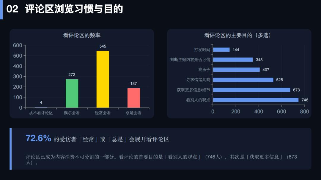 仅有0.4%的受访者表示"从不看评论区",这几乎可以忽略不计。在今天的内容消费链条中,"刷完内容看评论"已经成为一种近乎本能的行为习惯。
