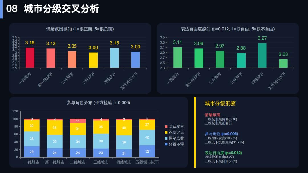 卡方检验 (p=0.006) 表明,不同城市层级的评论区参与角色分布存在显著差异。二线城市的"活跃发言"比例为10.7%,远超其他层级 (一线仅2.7%,五线以下仅1.7%) 。而五线城市以下的"只看不评"比例为31.7%,是最高的。