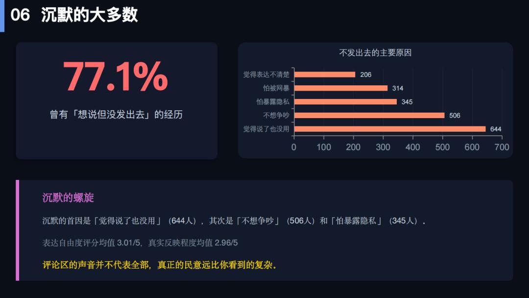 这意味着:你在评论区看到的,大概率只代表了那些敢于发声的少数人。真正的多数——那77.1%曾经想说却没说出口的人——他们的想法、诉求和情绪,你永远看不到。