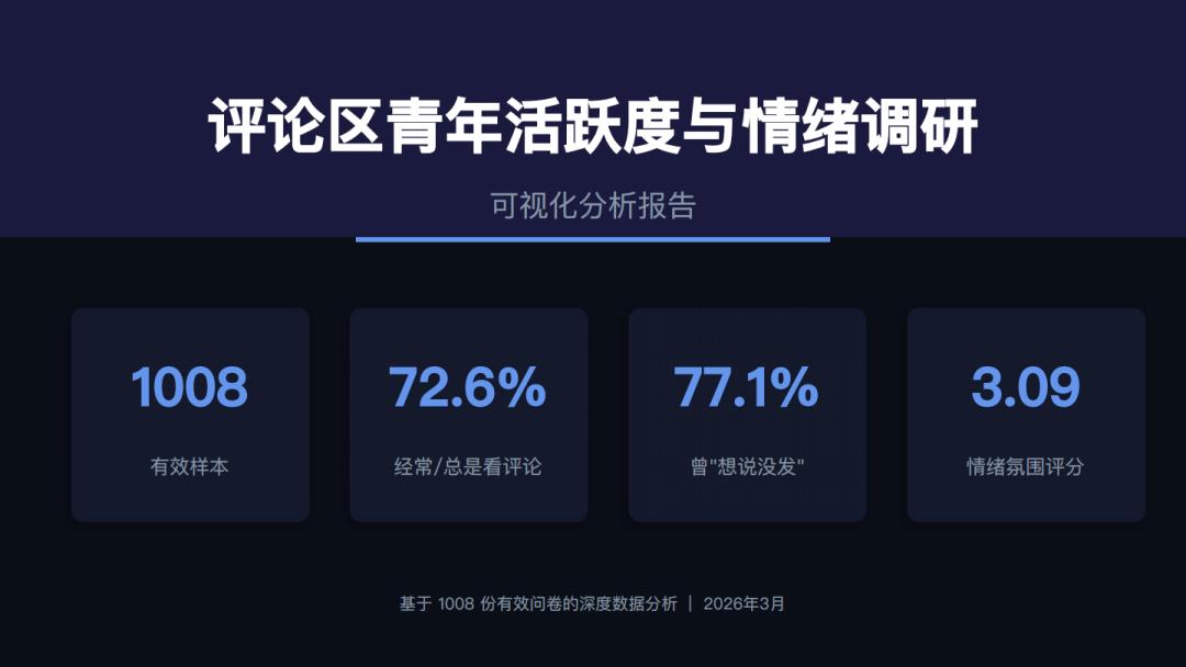 本报告基于腾讯研究院2026年初开展的“评论区青年用户活跃度与情绪感知”专项调研,共回收有效问卷1008份。受访者均为中国大陆地区活跃互联网用户,年龄集中在18-35岁。