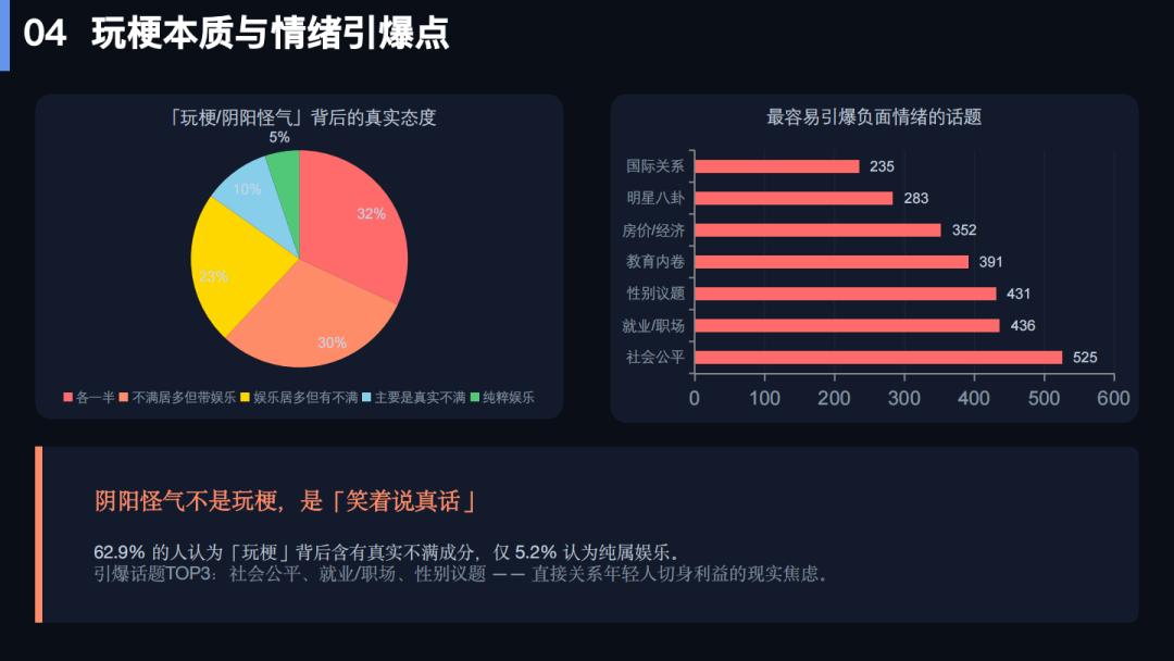 第三,"笑着说真话"的背后是真实的社会焦虑。62.9%的人认为玩梗背后含有真实不满,而引爆负面情绪的TOP5话题全部指向民生议题——社会公平、就业、性别、教育、房价。梗是表象,焦虑是实质。与其治理"阴阳怪气"的表达形式,不如正视它所折射的结构性问题。