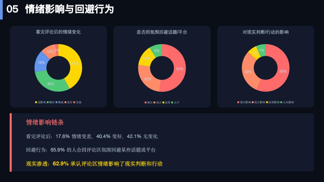 更值得关注的是评论区情绪向现实世界的渗透。65.9%的受访者表示会因为评论区氛围而回避某些话题或平台 (经常14.2% + 偶尔51.7%) 。而62.9%的人承认评论区的情绪曾影响了自己的现实判断和行动 (经常6.6% + 偶尔56.3%) 。