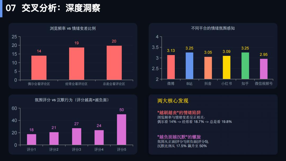 浏览频率越高,情绪变差的比例越高。这不是一个巨大的跳跃,但它是一个稳定的、单调递增的趋势——统计学上的"剂量-反应关系"。评论区里的情绪污染,像慢性毒素一样在不知不觉中侵蚀着重度用户的心理状态。