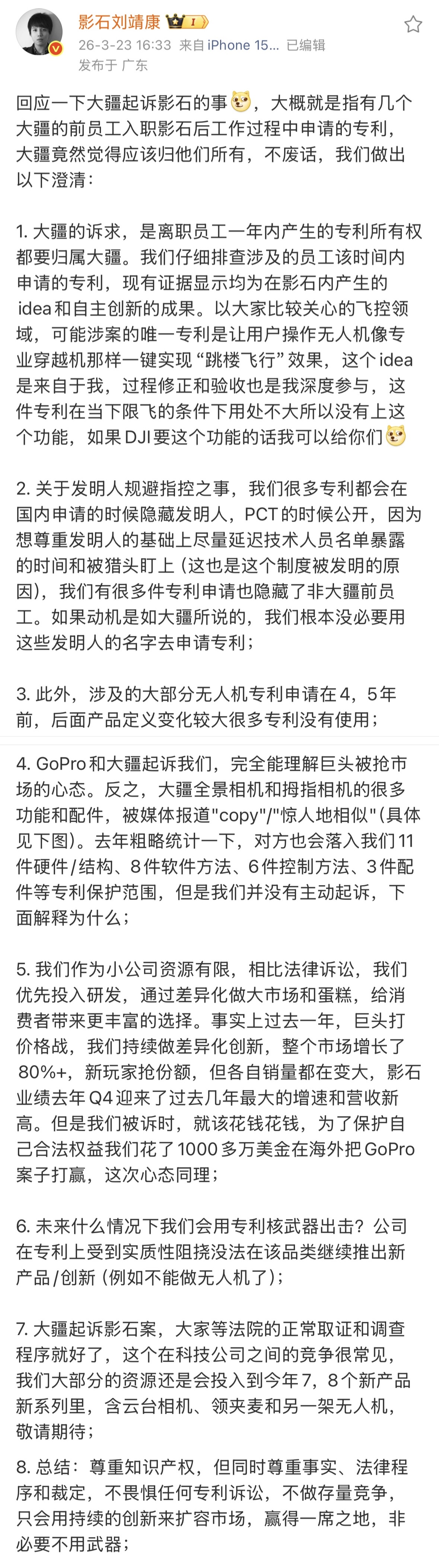 影石创新CEO刘靖康公开回应了大疆的指控。他表示:“大疆的诉求是离职员工一年内产生的专利所有权都要归属大疆。我们仔细排查涉及的员工该时间内申请的专利,现有证据显示均为在影石内产生的idea和自主创新的成果。”