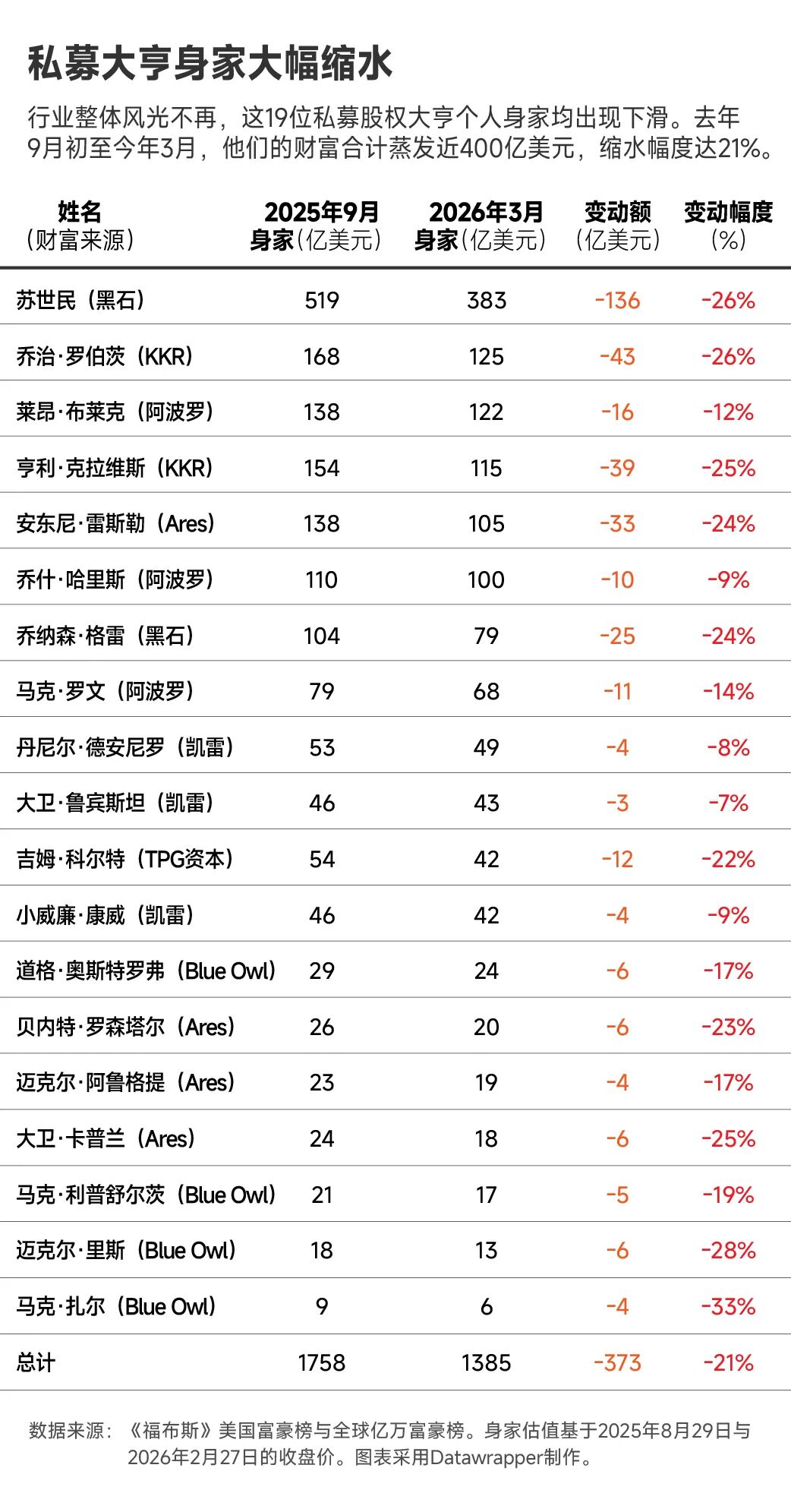 创办或执掌美国上市另类资产管理机构的19位顶级富豪中,过去半年所有人的财富都出现下滑。根据《福布斯》近期发布的全球亿万富豪榜和去年9月发布的美国富豪榜,这一小群富豪的身家合计蒸发超370亿美元。