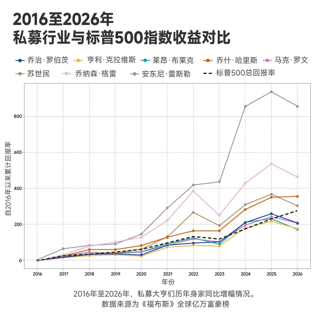 这些逆风对Blue Owl等新一代私募巨头而言是巨大挑战,但老牌巨头们凭借多年复利增长,基本安然无虞。过去十年,KKR、阿波罗、黑石和Ares四家机构的八位掌门人身家合计增长800亿美元,总财富涨幅达370%,远超同期标普500指数260%的回报率(含股息再投资)。而雷斯勒凭借Ares的亮眼表现,以及亚特兰大老鹰队带来的6倍投资回报,成为其中最大的赢家。
