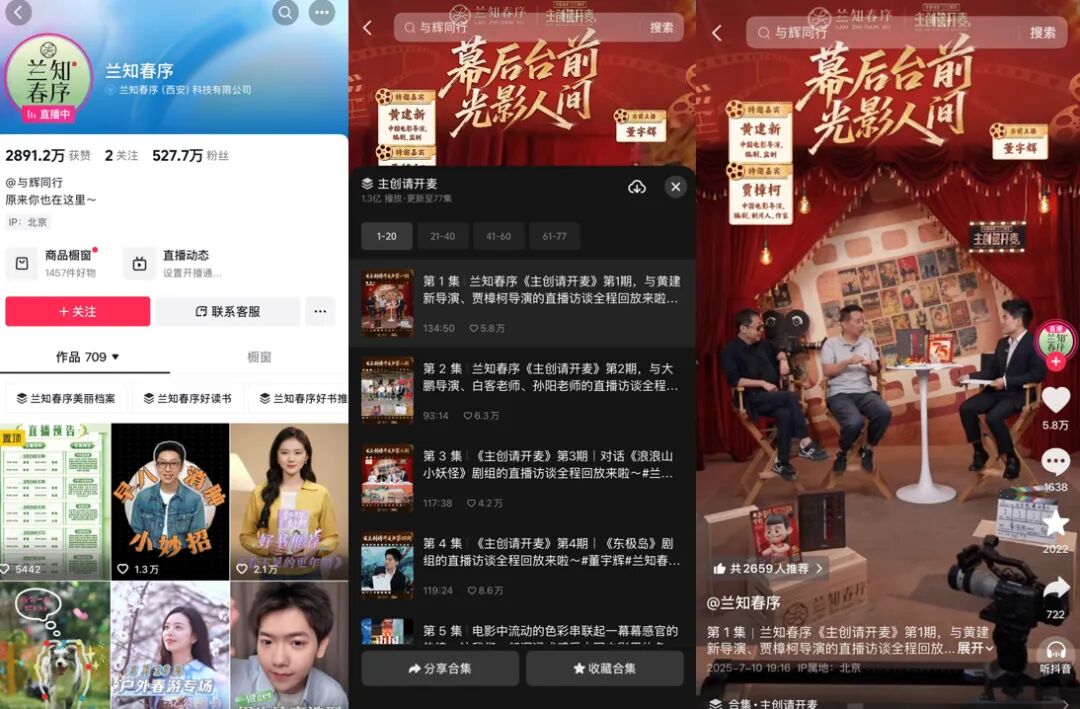 矩阵化运营是直播电商机构常见操作,也即通过旗下不同品类与调性的账号,实现总体布局最优。以董宇辉操盘的与辉同行为例,该机构在主阵地与辉同行账号之外,还在抖音打造了文化类账号“兰知春序”。兰知春序2025年7月8日晚8点的首场直播,是董宇辉对话导演黄建新和贾樟柯,三人在探讨电影工业的同时,还有力带货了《大众电影》杂志等商品。