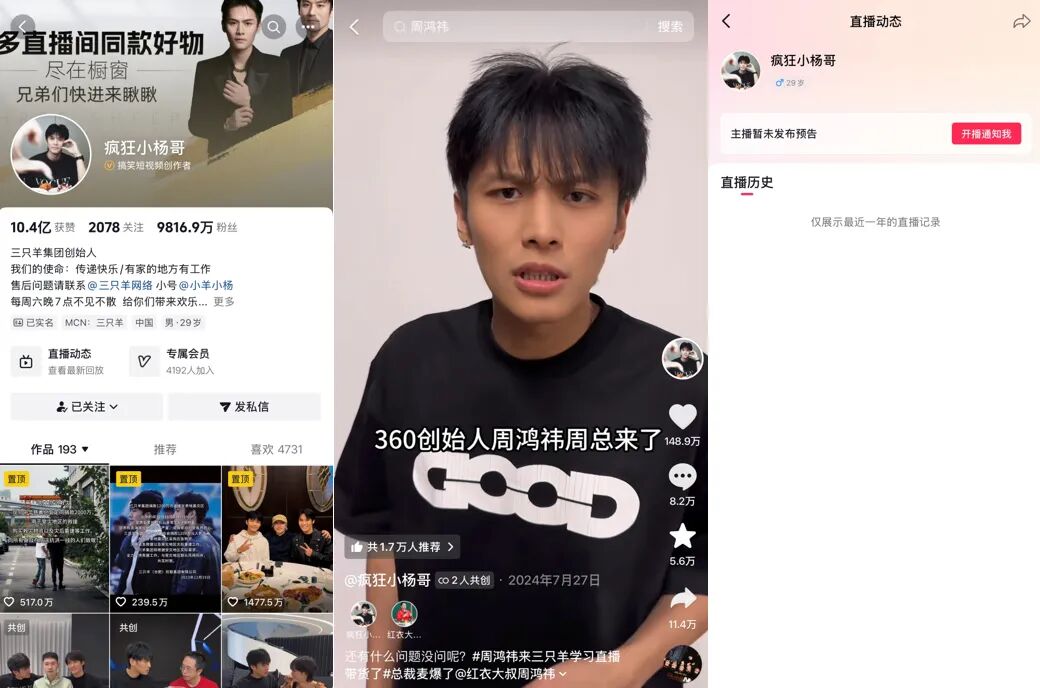 小杨哥主账号至今未在任何平台公开直播。2025年11月,拥有381万粉丝的“小杨臻选”在抖音平台试水复播,之后拥有983万粉丝的“三只羊网络”复播。但据报道,这些账号直播时观看人数至多几十万量级,GMV则仅二三十万元。