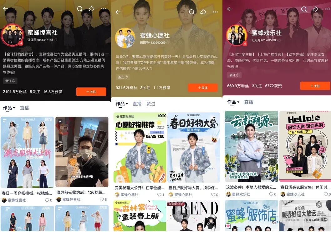 谦寻直播力量除了一度有林依轮、戚薇等多位签约明星艺人密切参与之外,更有旗下“蜜蜂惊喜社”“蜜蜂欢乐社”“蜜蜂心愿社”三大账号。目前单论淘宝直播这一个平台,“蜜蜂惊喜社”“蜜蜂心愿社”“蜜蜂欢乐社”就已分别拥有粉丝2191.5万、931.6万、660.9万。