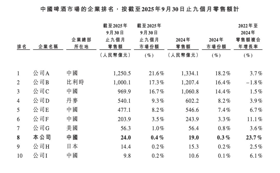 根据灼识咨询,按2024年及截至2025年9月30日止九个月零售额计,金星啤酒位列中国啤酒行业第八大企业,同时也是第五大本土啤酒企业。得益于其在啤酒精酿赛道持续耕耘和不断创新,以截至2025年9月30日止九个月零售额计,金星啤酒是中国精酿啤酒第三大企业和中国最大的风味精酿啤酒企业,市场占有率达14.6%。