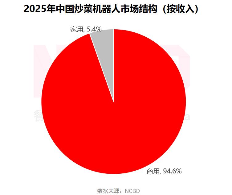 目前,炒菜机器人以商用为主,呈现出“商用先行,家用探索”的特点,2025年商用炒菜机器人的收入占比达94.6%。