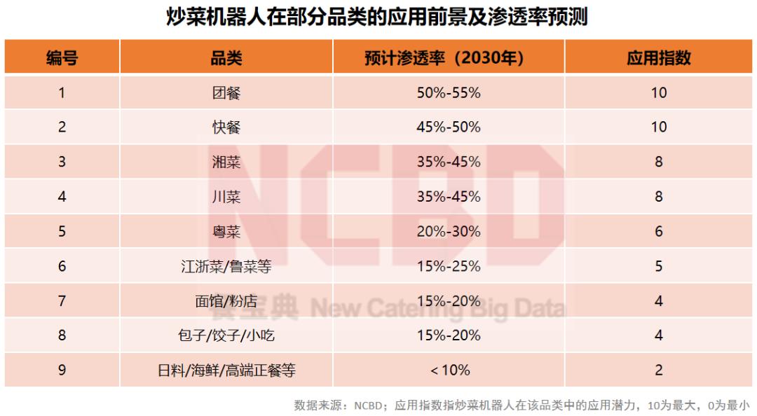 具体来看,炒菜机器人在团餐、快餐、湘菜以及川菜等领域有较大的发挥空间;而在日料/海鲜/高端正餐等领域,其发挥空间相对有限。